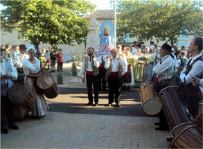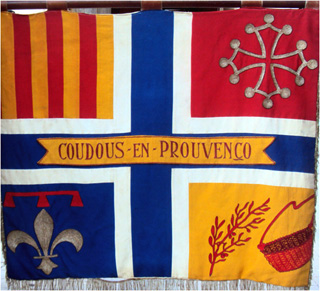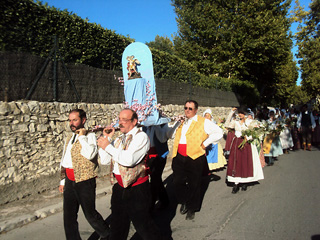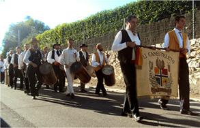 La procession de Saint-Michel dans le village : en tête la bannière du groupe coudoucen LI CANESTELETO suivi des tambourinaïres, puis arrive le groupe lituanien LINAGO et enfin les habitants de Coudoux et des alentours.
