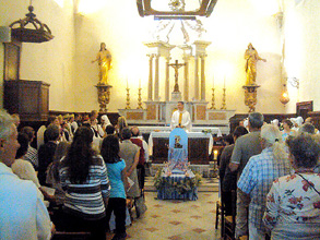Deux haies d'hon- neur de tambourins pour l'entrée dans l'église St Michel, après que l'assistance eût chanté l'hymne provençal, composé en 1868 par Frédéric Mistral : Coupo Santo.