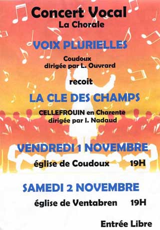 Un membre de la chorale "La Clé des Champs" du village de Cellefrouin en Charente est originaire de Coudoux, ce qui explique l'invitaiton de la chorale "Voix Plurielles" pour ce concert exceptionnel du jour de la Toussaint 2013 à Coudoux.