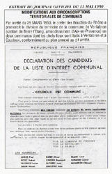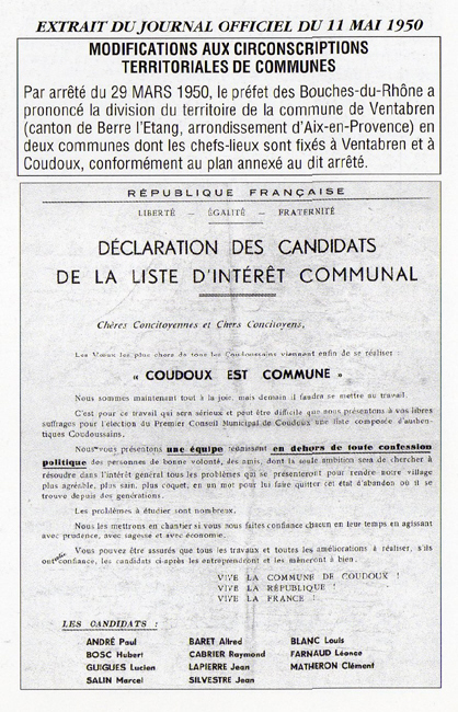 - le 21 septembre 1946, délibération du Conseil Municipal de Ventabren donnant un avis favorable à l'érection en commune distincte du hameau de Coudoux.