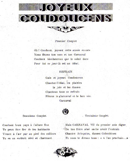 Coudoux fut longtemps…le royaume du carnaval. En effet, Coudoux, petit village à 16km d'Aix, avait sous les yeux l'exemple du carnaval aixois, carnaval burlesque, carnaval gigantesque ; de voir ce carnaval si près de nous, ça avait donné des idées aux anciens. Car les anciens, ils savaient s'amuser ! Entre les deux guerres, entre 1918 et 1939, le carnaval de, Coudoux était très connu dans les environs, parce qu'il était très joyeux. Il y avait pour commencer une fanfare, une fanfare assez nombreuse dirigée par deux véritables musiciens qui avaient réussi à transformer les paysans en instrumentalistes. Ils leur avaient appris le solfège et leur avaient fait acheter des instruments de musique, afin de former avec ces paysans rustiques une magnifique fanfare.