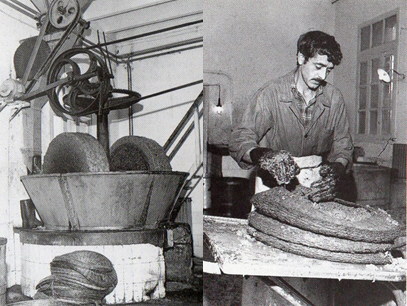 PHOTO 10 / moulin à huile : la meule à 2 roues écrase les olives puis les scourtins sont remplis à la main puis empilés dans les presses Victor Coq, qui exercent une pression peu élevée