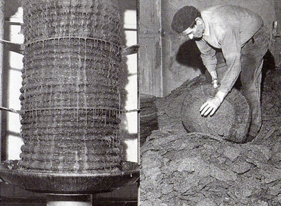 PHOTO 11 / moulin à huile : les scourtins sont empilés dans les presses Victor Coq, qui exercent une pression peu élevée; ensuite c'est le "descourtinage", avant de stocker les grignons