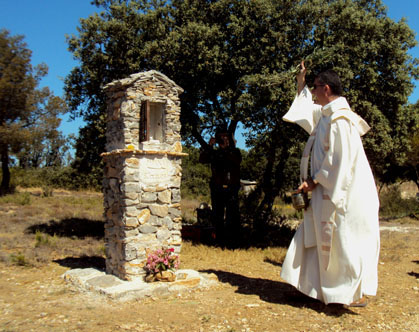 Le père François-Régis MICHAUD, curé de La Fare, bénit le petit édicule qui va désormais guider - et inspirer - la quête des pèlerins dans ce petit coin de Provence inondé de bleu