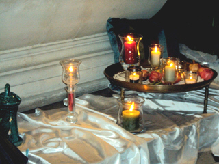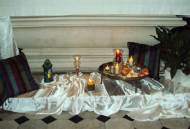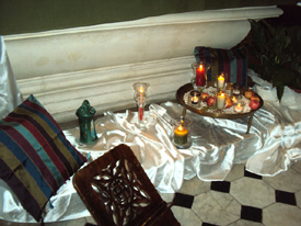Non seulement les lampes "à huile" mais aussi coussins et plateau de cuivre rappelant "l'Orient"
