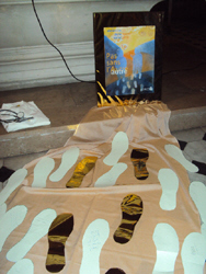 Les bénévoles de la pastorale de la Santé ont préparé ce chemin parsemé de pas dorés -auxquels ont été ajoutés les pas avec intentions- chemin qui mène à l'affiche "Pas sans l'Autre" pour nous rappeller, s'il en était besoin, qu'au jour du jugement, le Seigneur nous dira : "Ce que vous avez fait au plus petit d'entre les miens, c'est à moi que vous l'avez fait".
