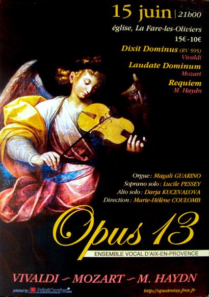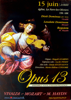 La musique sacrée proposée par OPUS 13 est celle des trois immenses compositeurs du XVIIIe siècle, Antonio Vivaldi, Mozart puis Haydn.