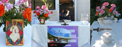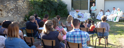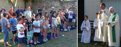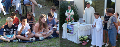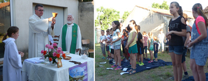 - 18H00 : la dernière rencontre du vendredi se termine, chaises et tables sont sorties des salles, on cherche le meilleur emplacement pour installer l'autel et l'assemblée dehors à l'ombre. Les enfants et deux futurs lycéens prêtent leur concours aux paroissien(nes) pour tout mettre en place. Il ne faut pas oublier les aubes des servants d'autel, les croix, la vaisselle liturgique...