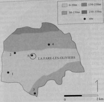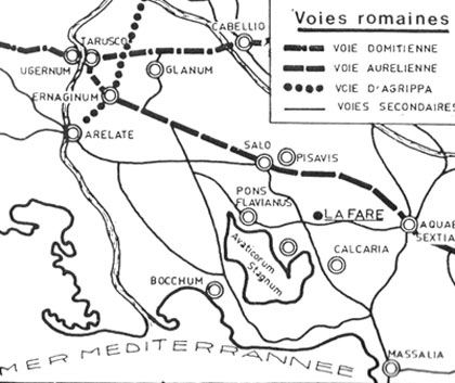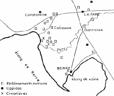 (Source : Carte Archeologique de la Gaule, l'Etang-de-Berre, pré-invention archéologique publiée sous la responsabilité de Michel Provost, professeur d'histoire romaine à l'Université d'Avignon, diffusion : Fondation Maison des Sciences de l'Homme, Paris 1996)