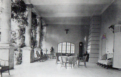 Terrasse à l'italienne : on voit une des pilastres du bâtiment originel, alors que les ouvertures sont postérieures à 1913, moment où le rez-de-chaussée est aménagé pour l'habitation.