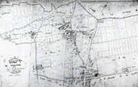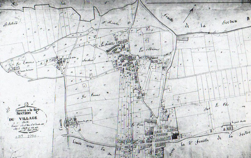 Feuille de la section C du cadastre, vers 1832-1833, chef d'œuvre de précision qui fixe l'état du tissu villageois à l'apogée de la Provence ancienne. Les parcelles en gris représentent le bâti, celles en blanc ou gris clair, le non-bâti. On distingue les deux pôles du village, encore bien séparés ainsi que l'essentiel des hameaux et écarts. Le tissu villageois est dans l'ensemble fort distendu : les limites sud-est laissent en dehors de l'agglomération le pavillon et le Grand Moulin, historiquement et géographiquement liés à la Grande Bastide… (La Fare-les-Oliviers « Le Temps Retrouvé », p.57)