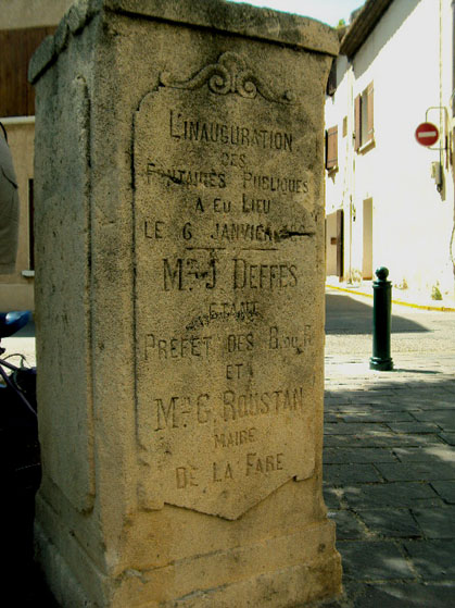 Sur une borne inaugurale, on peut lire que l'inauguration des fontaines publiques a eu lieu le 6 janvier 1889, Mr G. ROUSTAN étant maire.