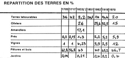 Selon le cadastre de 1832/1833, arrivent en tête les 356 hectares d'oliviers dans lesquels il conviendrait d'englober les amandiers. Les terres labourables ne couvrent que 112 hectares et les vignes 59. Les surfaces irriguées ne dépassent pas 22 hectares dont 3 sont consacrés aux jardins. Les terres incultes couvrent 565 hectares auxquelles on pourrait rajouter 40 à 50 hectares de jachères issues des assolements triennaux. C'est justement dans ces vastes terrains de parcours que dépaissent en 1836 quelques 2250 ovins et 300 redoutables chèvres. Le cheval est alors un luxe que s'offrent les riches : seulement 25 contre 142 mulets et 45 ânes…