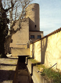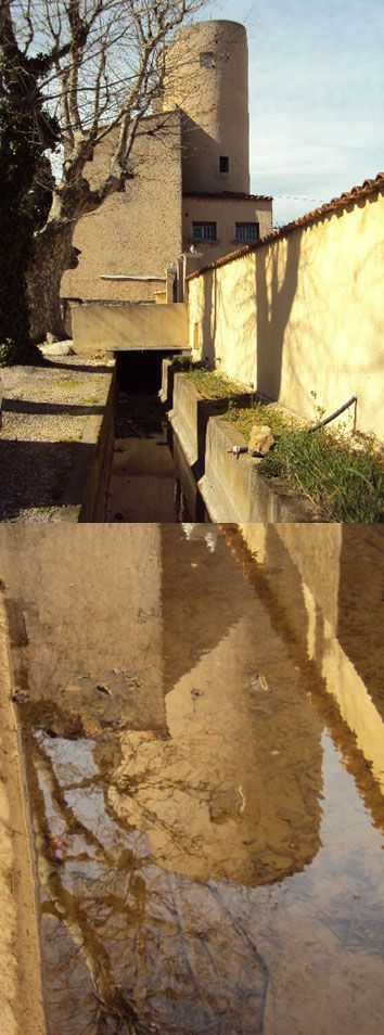 On voit ici le fossé en amont de "la Machine" : l'édifice carré servait à abriter un système sophistiqué de martellières qui réglaient le débit du canal pour le Grand Moulin, en aval, et pour l'irrigation des terres au sud-ouest du terroir.