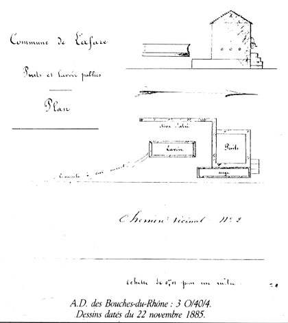 En 1888 l'ensemble est aménagé et on peut lire : « Il existe au bas du village de La Fare, le long du chemin vicinal n°2, un puits couvert alimenté par une source d'eau douce et muni d'une pompe aspirante. Un lavoir en pierres de taille est établi à côté du puits. Ces puits et lavoirs qui sont d'une grande utilité pour les habitants de la commune se trouvent actuellement dans un état de délabrement complet et exigent des réparations indispensables… En outre, la conduite à ciel ouvert qui sert à l'écoulement des eaux savonneuses ne présente pas une pente suffisante : les eaux croupissent et répandent des miasmes délétères portant atteinte à la santé publique et notamment sur un point le plus fréquenté du pays ». (La Fare-les-Oliviers « Le Temps Retrouvé », p.44)