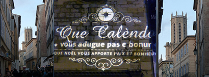 Sur le mur de la cathédrale, une phrase provençale est projetée en caractères lumineux :