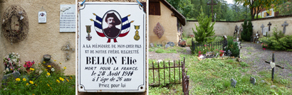 BAYASSE, LE CIMETIERE: dans le petit cimetière qui jouxte l'église, la plaque d'un Poilu de 14-18, Elie Beillon, mort pour la France le 28 août 1914 à Ménil-sur-Belvitte (Vosges).