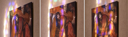 Simon-Pierre, qui le suivait, arrive à son tour. Il entre dans le tombeau ; il aperçoit les linges, posés à plat,