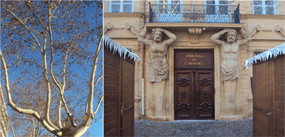 Cours Mirabeau (Lou Cous), ciel d'hiver provençal, les deux atlantes sculptés par Jacques Fossé soutiennent patiemment le balcon de l'Hôtel Maurel de Pontevès (XVIIe siècle).