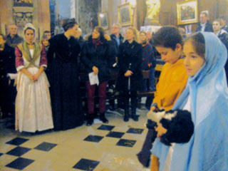 La procession de l'offrande symbolique du Pastrage a fait le tour de l'église avant de remonter par l'allée centrale, menée par le tambourinaïre suivi par Marie portée par un âne, puis un berger et une bergère portant chacun un jeune agneau, les moutons puis les personnes en costume provençal... et se termina avec un chant traditionnel a capella de M. Jean-Louis FEUTRIER devant l'autel.