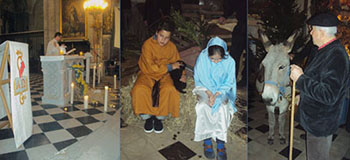 Ci-contre, l'âne et son maître, près de Joseph et Marie assis sur une botte de paille.