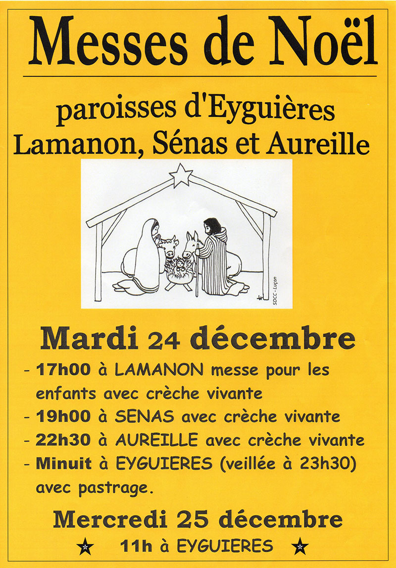Dans la grande église d'Eyguières -archicomble - la traditionnelle Messe de Minuit - célébrée par le Père Christophe NOWAK, curé de de l'Unité Pastorale ELSA - était précédée dès 23H30 de chants de Noël interpétés par la chorale de la messe de minuit, dirigée par M. BERNARD-SAVOYE et accompagnée à l'orgue, à la flûte traversière, à la flûte de pan, au violoncelle, pendant que tintinabulaient les cloches des animaux du pastrage, le boeuf (en l'occurence la vache "Chérie"), l' âne (de son nom "Cigalou") et les moutons, qui sont amenés par la famille PORRACCHIA d'Eyguières, depuis plusieurs générations.