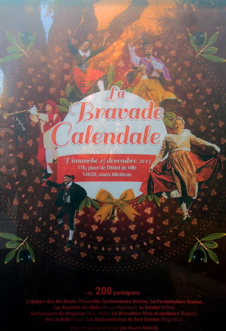 La Bravade Calendale d'Aix-en-Provence est un foisonnement de musiques et de danses traditionnelles avec cette année + 200 participants, et les groupes suivants : Li Balaire dóu Rèi Reinié, l'Ensemble Tambourinaire Sestian, Lei Farandoulaire Sestian, Lou Roudelet dei Mielo (Aix-en-Provence), Le Condor (Arles), Les Lanceurs de drapeaux (Asti, Italie), Lei Bravadaire fifres et tambours (Barjols), Nice la Belle (Nice), Les tambourinaires de Sant Sumian (Brignolles).