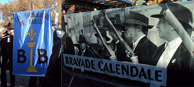 Près de la Rotonde : la bannière bleue de Lei Bravadaire de Barjòu, devant l'affiche de la Bravade Calendale. Au XIIIe siècle, le frère de Saint Louis, Comte de Provence, aurait institué au retour des croisades "Les Bravades", des fêtes à la fois religieuses et militaires consistant en un tir aux pigeons agrémenté de processions composées de bourgeois, du corps "municipal et du parlement" (REF : Les Bravades par Ph. Jumaud & Hélène Saurel). Les Bravades connaissent essor et solennité vers 1470, elles sont encore pratiquées par plusieurs villes du Var : Les Arcs en Provence, Barjols, Draguignan, La Garde Freinet, Fréjus, St Tropez et Vidauban. (Source : site de la ville de Vidauban)