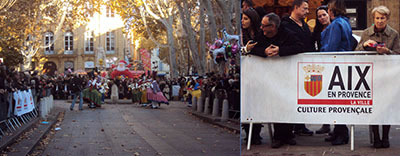 A 15H00, le défilé commence, une foule considérable est massée sur le Cours Mirabeau, pour admirer les groupes provençaux avec musiciens et danseurs remontant un à un la grande avenue.