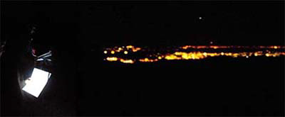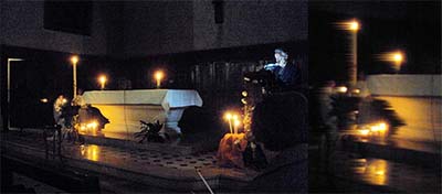 Méditation sur la Passion du Christ dans le silence de la nuit, loin de l'agitation fébrile de la société de consommation, que seules rappellent de vagues lumières au loin.
