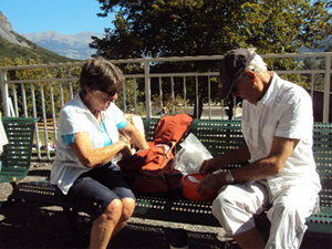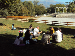 Les CERISIER de La Fare se préparent à attaquer les étapes sérieuses du déjeuner sorti du sac, en même temps que tous les autres paroissiens dispersés par petits groupes sur la vaste esplanade du sanctuaire, optant pour la pelouse ou les bancs selon les préférences.
