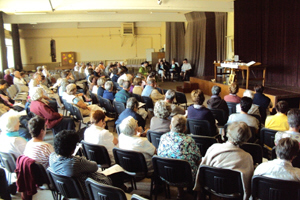 L'assemblée réunie autour du père François-Régis MICHAUD, écoute avec attention le dialogue préparé par le groupe d'étude de Vatican II.