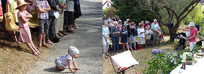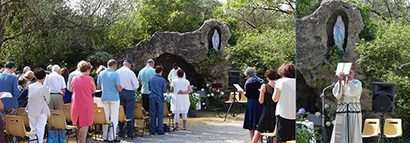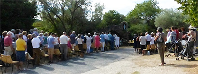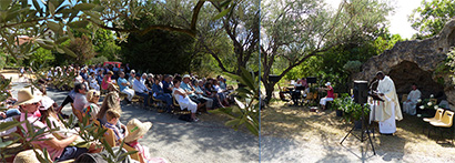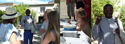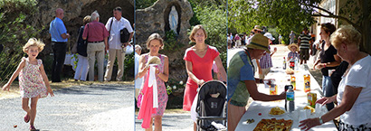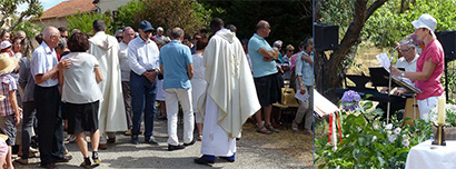 Un verre de l'amitié clôture cette célébration du 15 août, les paroissiens jeunes et moins jeunes se rendent au buffet, sous les ombrages.