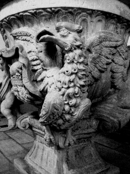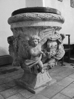 Fonds Baptismaux (XVIe siècle) en pierre, avec les 4 évangélistes sculptés en ronde-bosse.: Marc : le lion, Matthieu : l'ange, Luc : le taureau - Jean : l'aigle.