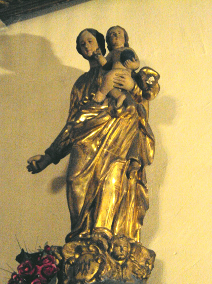 Au-dessus du porche de l'église, une niche avec une coquille, la Vierge et l'Enfant, sous les pieds de la Vierge, un serpent et l'inscription latine :