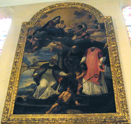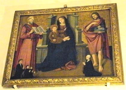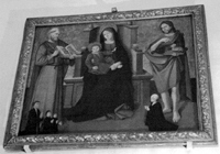 La Vierge est entourée de saint Pierre et saint Jean-Baptiste. C'est un ex-voto de la famille de Venel qui est peinte agenouillée.