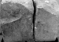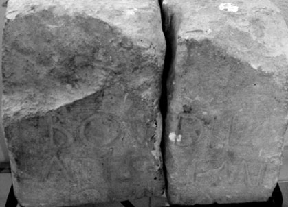 - L'inscription gallo-latine, gravée sur un bloc rectangulaire chanfreiné (haut. 0,50m ; larg. 0,35m ; épais. 0,31m), comporte deux lignes incomplètes :