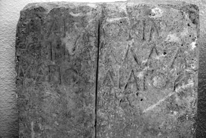 Cippe (milieu du 1er s. av. J.C.) découvert en 1977 : Epitaphes conjugales jumelées gallo-grecques : le nom du défunt à gauche (ECCAOIS), le nom de la défunte à droite (VIMPILLA). (Roquefavour)